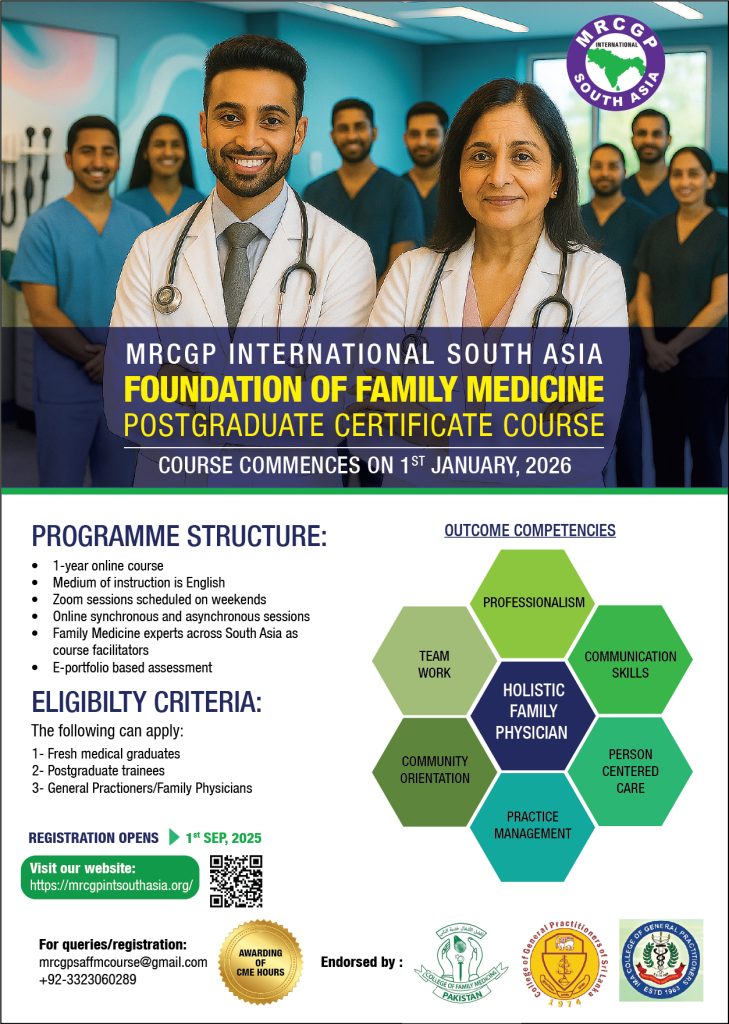 The MRCGP [INT.] South Asia Board is pleased to announce the registration for the 1-Year Online Certificate Course in Family Medicine 2nd Batch 2026.